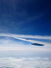 離陸から15分。 雲のじゅうたんを抜け、やっと青空が |