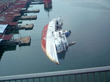 目を疑うような景色に慌てて1枚パチリ。 大きな港の隅で、船がこんな状態に! 聞くと、これは事故ではなく、 ごく普通に”放置”されているだけとのこと。 日本では考えられませんね。 不況で引き上げる費用がないのでしょうか。 お国柄なのでしょうか。 |